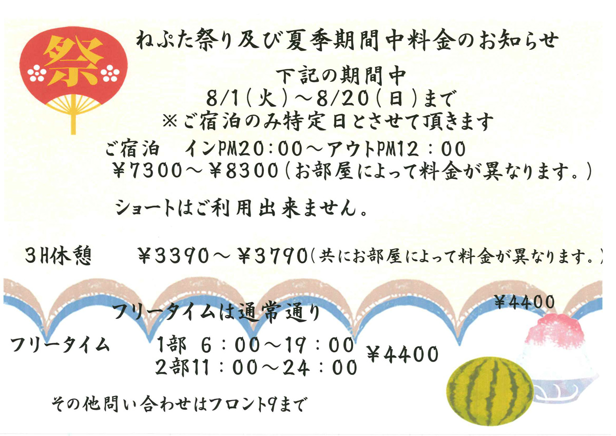 8月1日(火) 〜 8月20日(日)まで、ご宿泊のみ特定日とさせていただきます。